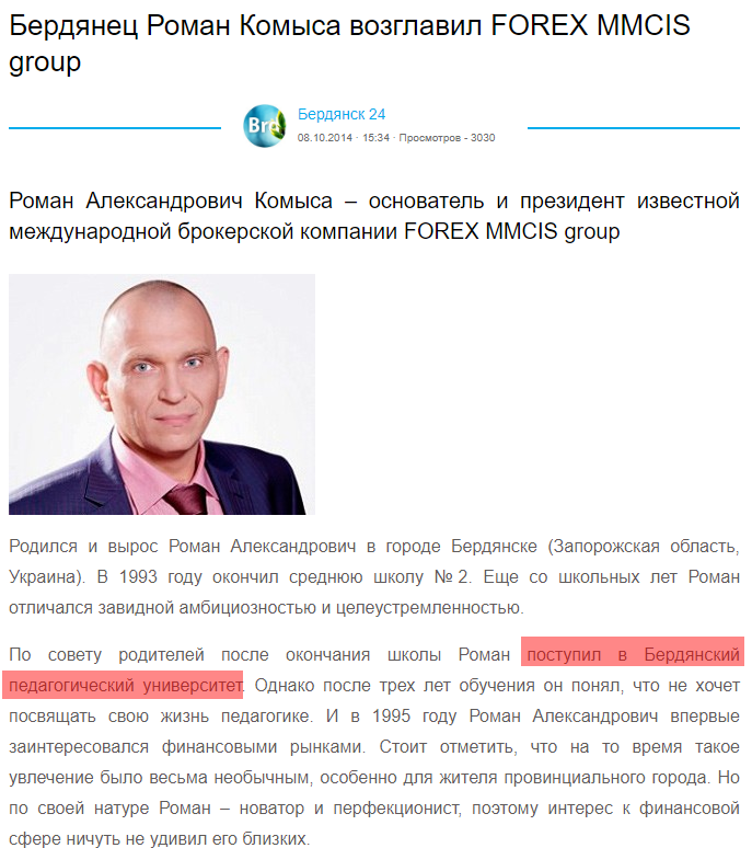 Через много лет человек по имени Роман Комыса всплыл как генеральный директор компании FOREX MMCIS group. Он возглавил ее в 2014 году, сообщали бердянские СМИ.