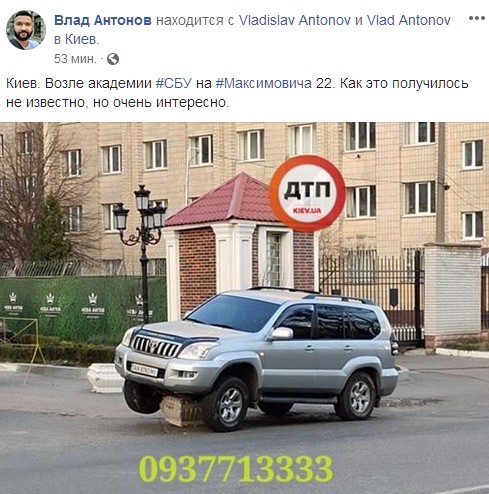 "Киев. Возле академии #СБУ на #Максимовича 22. Как это получилось не известно, но очень интересно", - говорится в подписи.