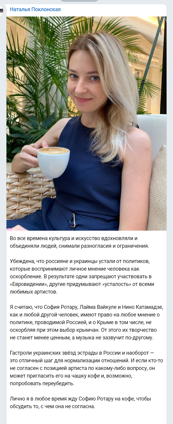 "Гастроли украинских звезд эстрады в России и наоборот – это отличный шаг для нормализации отношений. И если кто-то не согласен с позицией артиста по какому-либо вопросу, он может пригласить его на чашку кофе и, возможно, попробовать переубедить", – написала политик.