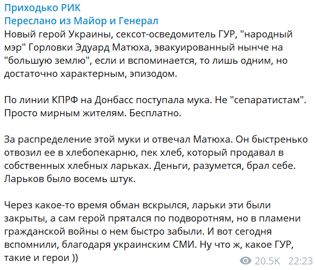 "Новый герой Украины, сексот-осведомитель ГУР, "народный мэр" Горловки Эдуард Матюха, эвакуированный нынче на "большую землю", если и вспоминается, то лишь одним, но достаточно характерным, эпизодом.