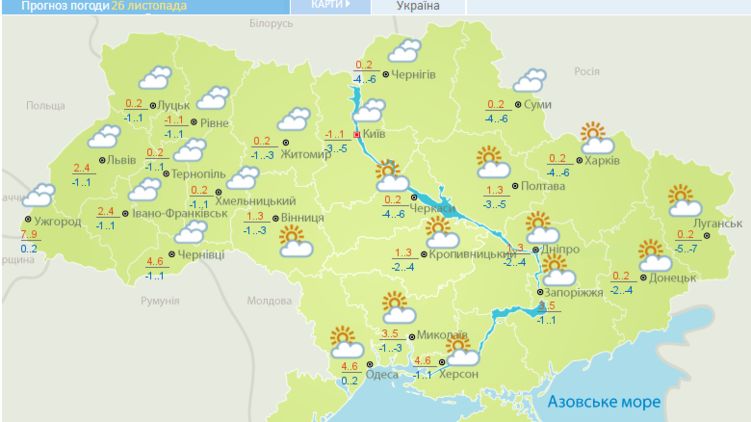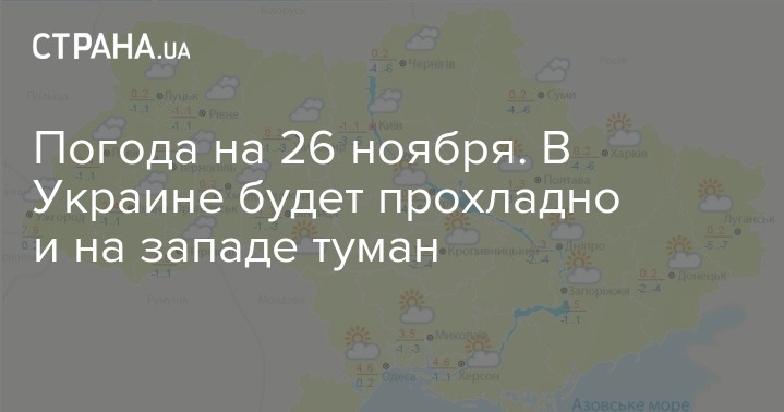 Сегодня, 26 ноября, в Украине ожидается туман, температура от -2 до +2 С. Ночью возможны заморозки до -6 в центральном регионе. Теплее всего ожидается в Закарпатье, до +9 С. Об этом говорится в прогнозе Укргидрометцентра.