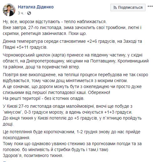 В Киеве осадки маловероятны, днем ожидается + 1...+ 3 градуса. К концу недели в столице потеплеет до +5 градусов, но будут дожди. "Это потепление будет кратковременным, 1-2 декабря снова к нам придет похолодание. Поэтому пока все равно внимательно следим за прогнозами погоды и за головой. Потому что изменчивость и прыжки будут и там, и там", - написала Диденко.