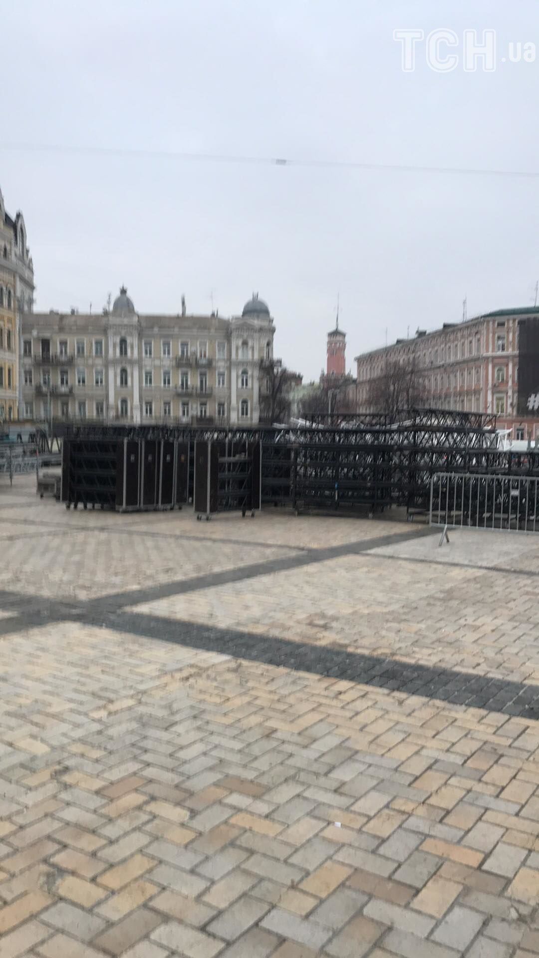 Уточняется, что первым делом начали монтировать подставку-стержень для елки. В этом году 30-метровое главное новогоднее дерево страны быдет не целым, а собранным из множества веток. Также на Софийской площади появились конструкции для сцены.