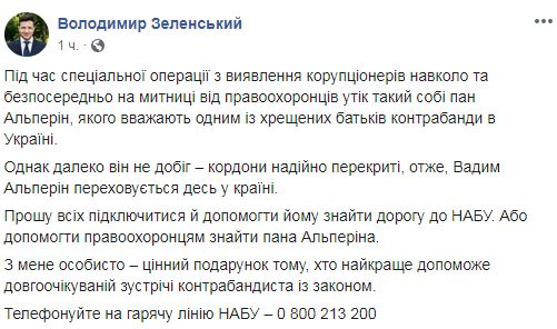 Во время специальной операции на таможне сбежал один из фигурантов дела о коррупции, известный предприниматель Вадим Альперин, сообщил президент Украины Владимир Зеленский на своей странице в Facebook.