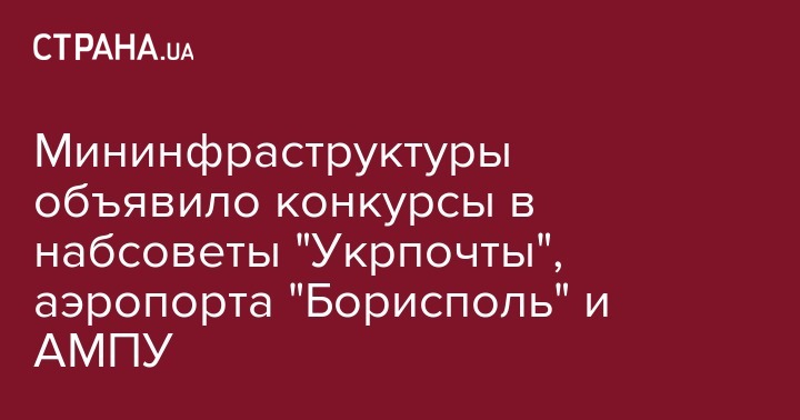 Министерство инфраструктуры Украины объявило конкурсы на должности представителей государства - членов наблюдательных советов "Укрпочты", международного аэропорта "Борисполь" и Администрации морских портов (АМПУ), сообщается на сайте ведомства.