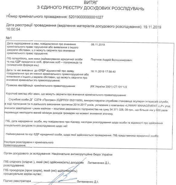 Портнов также опубликовал выписки из Единого реестра досудебных расследований, из которых следует, что уголовные производства открыты по ст. 191 ч. 5 (Присвоение, растрата имущества или овладение им путем злоупотребления служебным положением), ст. 204 ч. 3 (Незаконное изготовление, хранение, сбыт или транспортировка с целью сбыта подакцизных товаров) и ст. 364 ч. 2 (Злоупотребление властью или служебным положением) Уголовного кодекса Украины.