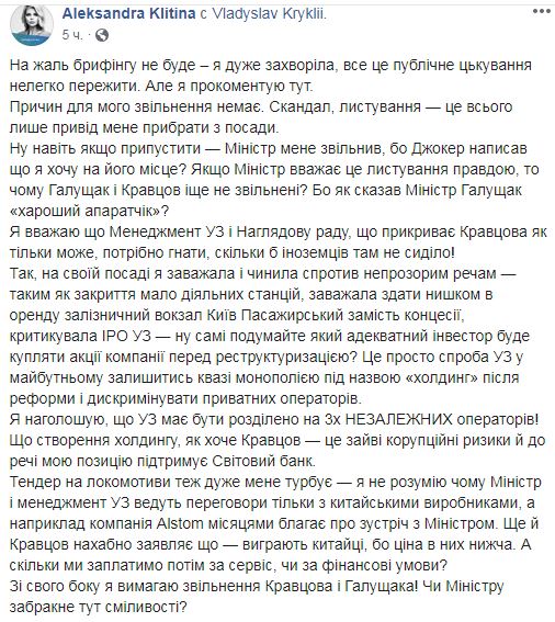 "Со своей стороны я требую увольнения Кравцова и Галущака! Или министру не хватит здесь смелости?", - написала она. По словам Клитиной, на своей должности она мешала непрозрачным решениям министерства, таким как закрытие малодеятельных станций, мешала незаметно сдать в ​​аренду железнодорожный вокзал "Киев-Пассажирский" вместо концессии, критиковала IPO "Укрзализныци".