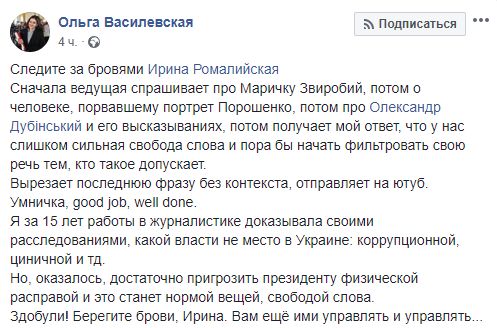 "Следите за бровями, Ирина Ромалийская. Сначала ведущая спрашивает про Маричку Звиробий, потом о человеке, порвавшем портрет Порошенко, потом про Александра Дубинского и его высказывания, потом получает мой ответ, что у нас слишком сильная свобода слова и пора бы начать фильтровать свою речь тем, кто такое допускает.