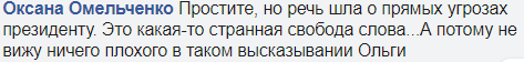"Простите, но речь шла о прямых угрозах президенту. Это какая-то странная свобода слова...А потому не вижу ничего плохого в таком высказывании Ольги".