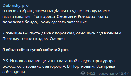 "В связи с обращением Нацбанка в суд по поводу моего высказывания - "Гонтарева, Смолий и Рожкова - одна воровская банда", - хочу сделать заявление. К женщинам, пусть даже к воровкам, отношусь с уважением. Поэтому только в адрес Смолия: я е@ал тебя в тупой собачий рот", - написал Дубинский.
