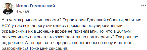 "А в чем "срочность" новости? Территории Донецкой области, занятые ВСУ, у нас всю дорогу считались временно оккупированными. Украинскими их в Донецке вроде не признавали. То, что в 2019-м расчехлились наконец это законодательно подтвердить? Так раньше надо было. А теперь вот очередные переговоры на носу и на тебе - разродились! Тоже мне сенсация", - считает местный блогер Игорь Гомольский.