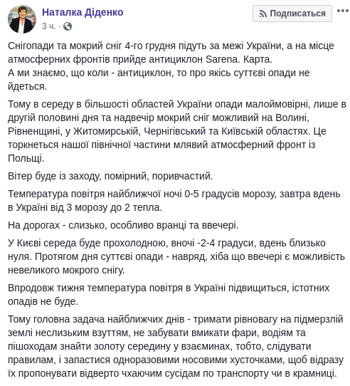 Вместо снегопадов и мокрого снега с 4 декабря в Украину придет антициклон Sarena. А это значит, что осадки 4 декабря маловероятны. Об этом пишет на своей странице в Facebook синоптик Наталья Диденко.