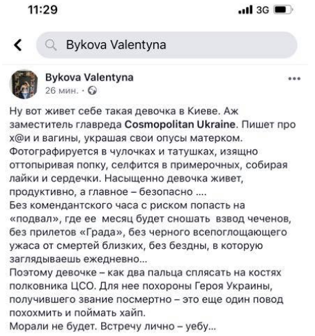 Заместитель главреда журнала Cosmopolitan Ukraine Евгения Плихина высмеяла в Facebook похороны полковника ЦСО "Альфа" СБУ, 37-летнего снайпера Дениса Волочаевана, который погиб на Донбассе, выполняя боевую задачу.
