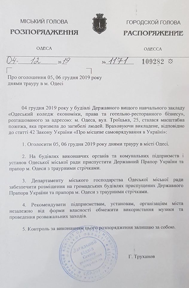 Городской голова привел фото своего распоряжения, в соответствии с которым 5 и 6 декабря будут траурными днями. В знак траура Труханов постановил приспустить государственные флаги и флаги Одессы на учреждениях, а также дополнить их черными лентами.