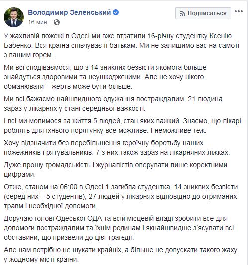 "В ужасном пожаре в Одессе мы уже потеряли 16-летнюю студентку Ксению Бабенко. Вся страна сочувствует ее родителям. Мы не оставим вас в одиночестве с вашим горем", - сообщил президент. Он добавил, что надеется, что 14 пропавших без вести как можно быстрее найдутся здоровыми и невредимыми.
