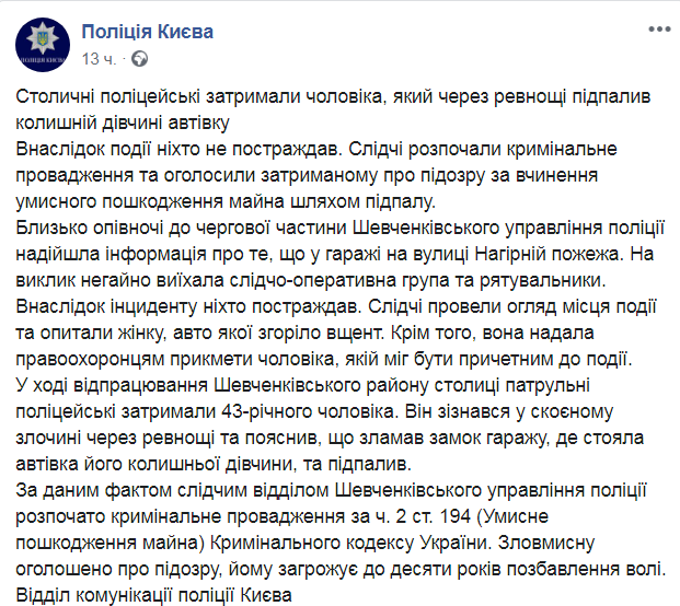 Столичные полицейские задержали 43-летнего мужчину, который в порыве ревности совершил поджог автомобиля бывшей девушки. Об этом в Facebook сообщает отдел коммуникации полиции Киева.