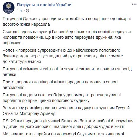 Сегодня, 7 декабря, в Одессе женщина родила, не добравшись до роддома. Об этом сообщается на официальной странице пресс-службы Патрульной полиции Украины в Facebook.