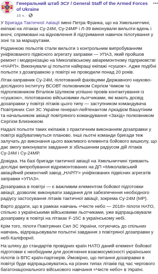 Пилоты самолетов Су-24М, Су-24МР и Л-39 из 7-й бригады тактической авиации им. Петра Франка Воздушных сил Военных сил Украины в Хмельницкой области провели дневные и ночные тренировочные и впервые за 20 лет дозаправились воздухе. Об этом сообщил Генеральный штаб ВСУ.