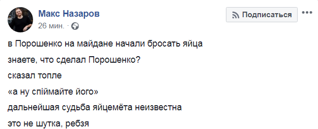 "В Порошенко на майдане начали бросать яйца. Знаете, что сделал Порошенко? Сказал толпе: "А ну спіймайте його!" Дальнейшая судьба яйцемета неизвестна", - написал журналист.