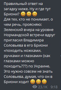 "Ну и где тут Бриони?  Для тех, кто не понимает, о чем речь, проясняю: Зеленский вчера на уровне Нормандской встречи вдруг пригласил Владимира Соловьева в его Бриони "походить ножками, ручками и глазками" (как глазками можно походить???) по Украине. Это нужно совсем не знать Соловьева, думая, что он в Бриони ходит", - написал он под фото.