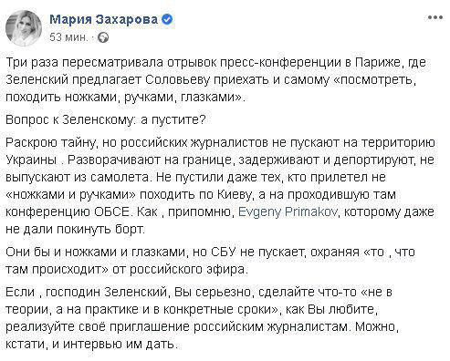 Его заявление также прокомментировала официальный представитель МИД России Мария Захарова, призвав его обеспечить допуск российских журналистов на территорию Украину и дать им интервью.