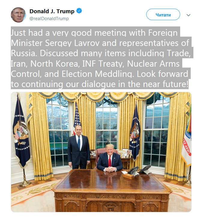 "Прошла очень хорошая встреча с министром иностранных дел Сергеем Лавровым и представителями России. Обсуждались многие вопросы, включая торговлю, Иран, Северную Корею, контроль над ядерными вооружениями и вмешательство в выборы. Надеемся на продолжение нашего диалога в ближайшее время", - написал Трамп.