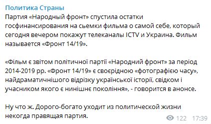 В то же время Telegram-канал Политика Страны пишет, что "партия "Народный фронт" спустила остатки госфинансирования на съемки фильма о самой себе". "Ну что ж. Дорого-богато уходит из политической жизни некогда правящая партия", - отмечается в сообщении.