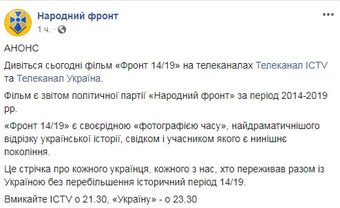 "Народный фронт" анонсировал выход фильма "Фронт 14/19", который в политсиле называют "отчетом политической партии". Об этом "Народный фронт" сообщил в Facebook.