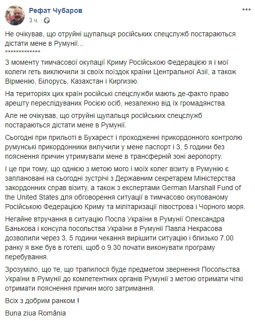 Глава Меджлиса крымскотатарского народа Рефат Чубаров сообщил, что во время прохождения пограничного контроля в Бухаресте, румынские пограничники изъяли у него паспорт и 3,5 часа без объяснения причин удерживали в трансферной зоне аэропорта. Об этом он сообщил на своей странице в Facebook.
