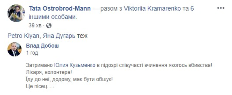 "Подозрение Андрею Антоненко и ЕЩЕ ОДНОЙ моей подруге Яне Дугарь: "Увлекшись ультранационалистическими идеями, культивируя величество арийской расы, разграничение по принципу национальной принадлежности..." Напомню: кроме Андрея и Яны задержаны также Юля Кузьменко... Три друга за ОДИН день! Ну вот что это за ПОЛНАЯ х*ета ???" - говорится на фб-странице Назара Приходько.