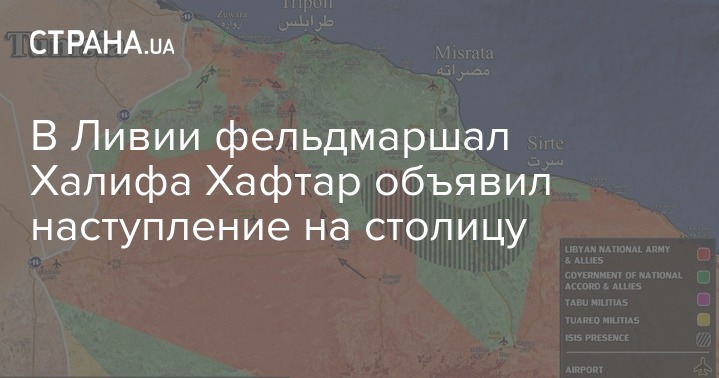 В Ливии командующий армией (ЛНА) фельдмаршал Халифа Хафтар, контролирующий бОльшую часть территории государства, объявил о начале решающего наступления на столицу - Триполи.