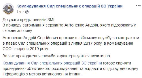 "По поводу задержания сержанта Антоненко Андрея, которого подозревают в совершении преступления. Антоненко Андрей Сергеевич проходит военную службу по контракту в рядах Сил специальных операций с июля 2017 года, в Командовании ССО с июня 2019 года. За время прохождения службы характеризуется положительно", - отмечается в сообщении.