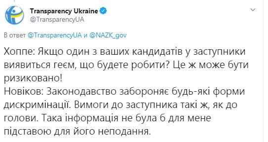 Также текстовую трансляцию в Twitter опубликовало Transparency International Ukraine.