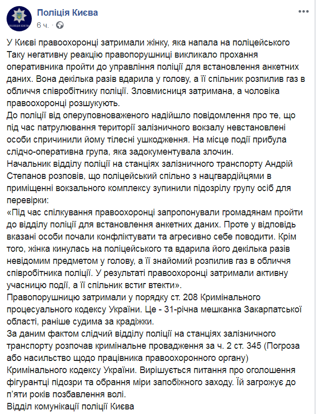 В Киеве правоохранители задержали женщину, которая напала на одного из них на вокзале после просьбы пройти в управление полиции для установления личных данных. Об этом сообщает в Facebook отдел коммуникации полиции Киева.