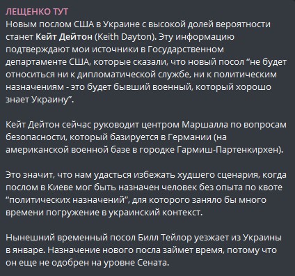 По словам источников Лещенко, новый посол "не будет относиться ни к дипломатической службе, ни к политическим назначениям - это будет бывший военный, который хорошо знает Украину".