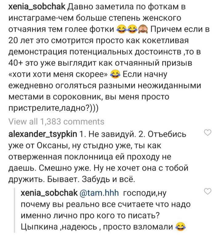 На пост отреагировала Ксения Собчак, с которой они ранее были дружны. Журналистка высказала мнение о том, что когда женщины за сорок публикуют столь откровенные снимки, это выглядит как отчаянный призыв "хоти меня".