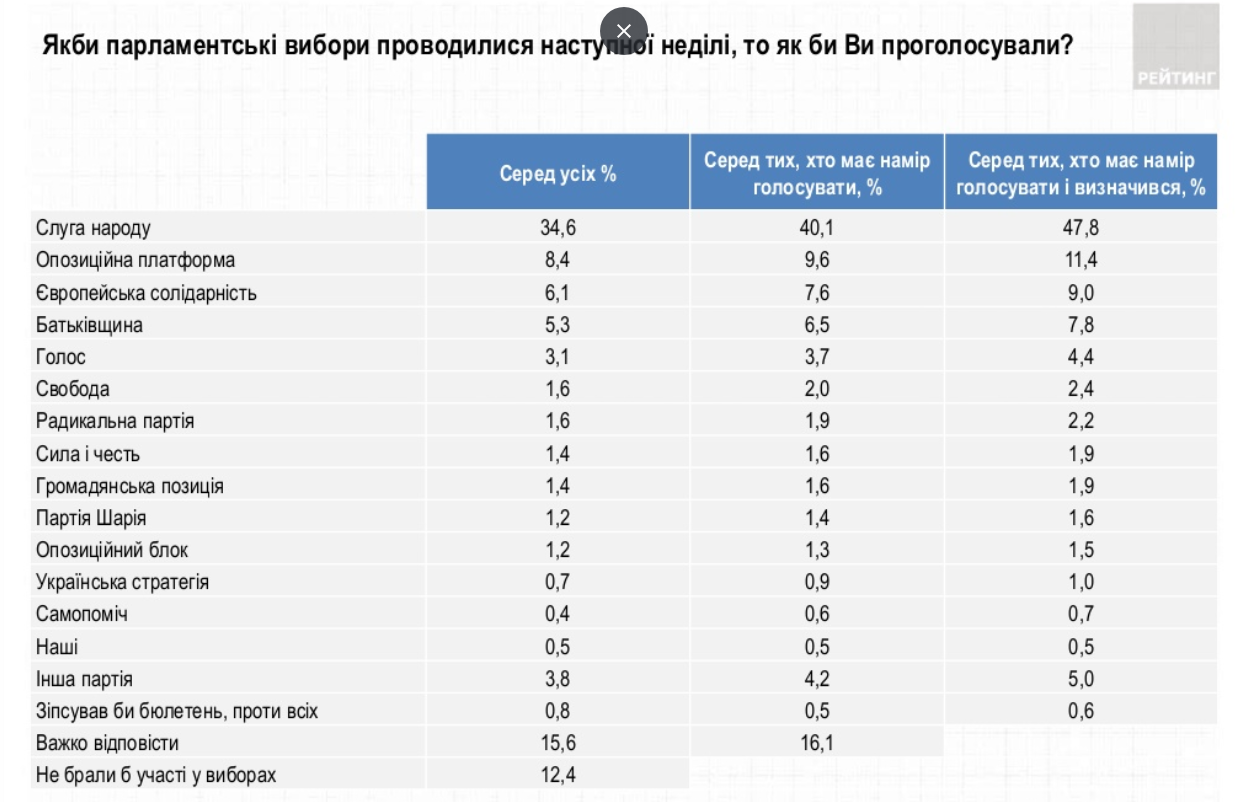Среди опрошенных, 11,4% поддерживают партию "Оппозиционная платформа - За жизнь", 9% партию "Европейская Солидарность", 7,8% - партию "Батькивщина", 4,4% - партию "Голос". Рейтинг других политических сил - менее 3%. Тех, кто не определился, – около 16%.