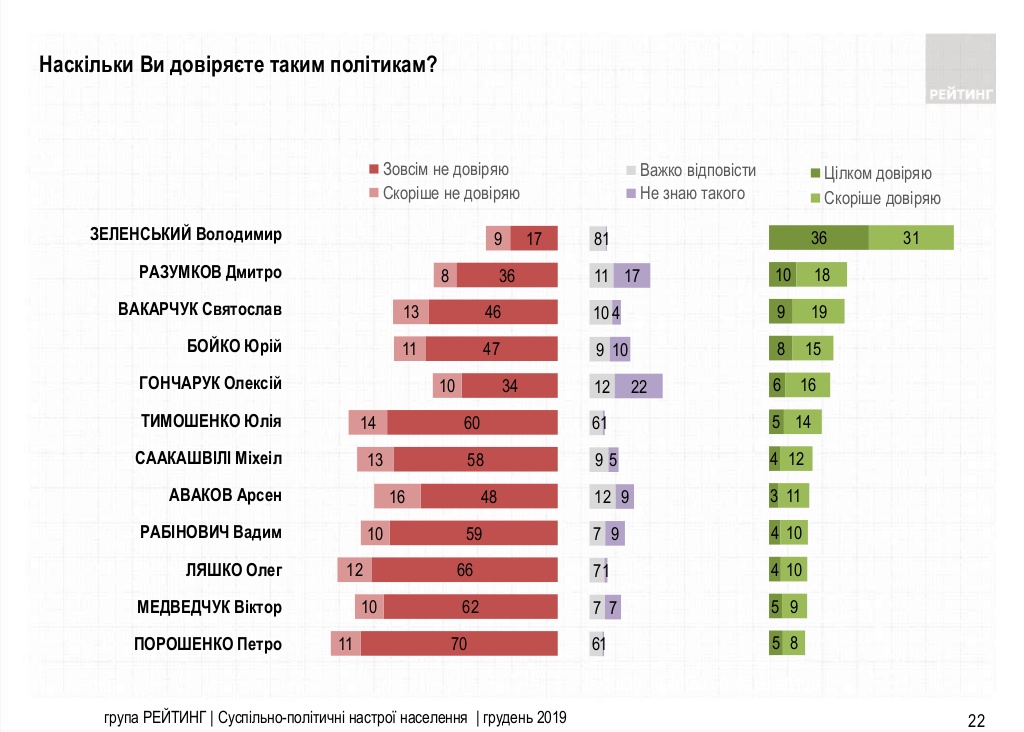 Так, у Святослава Вакарчука рейтинг доверия куда выше, чем у его партии. То же можно сказать и о Юрии Бойко. Лидером же антирейтинга доверия по-прежнему остается Петр Порошенко. А возглавляет рейтинг доверия Зе.
