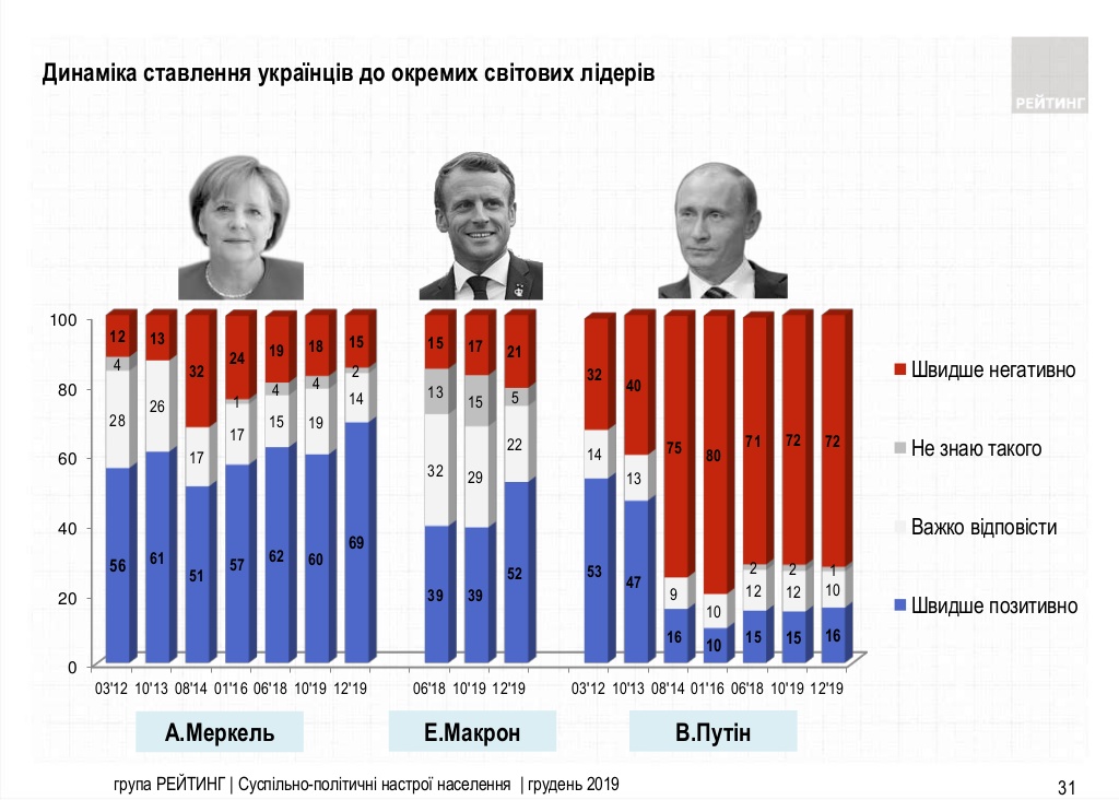 Также по следам нормандской встречи выросли рейтинги других ее организаторов – Ангелы Меркель и Эммануэля Макрона. Что косвенно подтверждает завышенные ожидания украинцев от этого саммита и большие надежды на окончание конфликта после него.