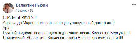 "Александр Маринченко вышел под круглосуточный домарест! (…) Янишевский, Аброськин, Зинченко - ждем Вас на свободе, парни!" - написал Рыбин.