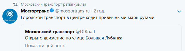 "Городской транспорт в центре ходит привычными маршрутами. Открыто движение по улице Большая Лубянка", - говорится в сообщении транспортников.