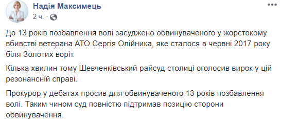 Шевченковский суд Киева арестовал на 13 лет без права на внесение залога подозреваемого в убийстве 57-летнего ветерана АТО Сергея Олейника - Анатолия Чивикова. Убийство произошло 22 июня 2017 года у станции метро "Золотые ворота" в Киеве. О приговоре сообщила пресс-секретарь прокуратуры города Киева Надежда Максимец на своей странице в Facebook.