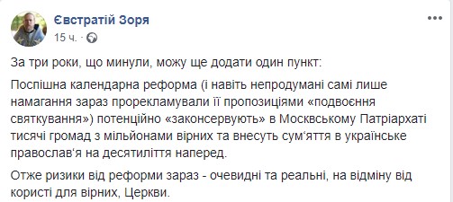 Как считает Зоря, риски от реформы церковного календаря сегодня очевидны и реальны.