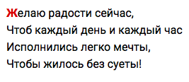 Поздравляю с Новым годом! Желаю, что он принес нам самое долгожданное и желанное. Желаю крепкого здоровья, веры в чудеса и свои силы! Люблю, скучаю и крепко целую!