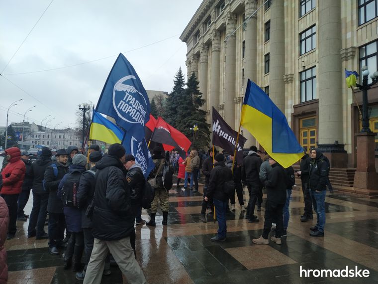 В Харькове возле здания облгосадминистрации около двухсот активистов "Национального корпуса", "Правого сектора", "Фрайкора" и общественной организации "Традиции и порядок" протестуют против возможного обмена обвиняемых в теракте возле Дворца спорта в 2015 году. Об этом сообщает Hromadske.