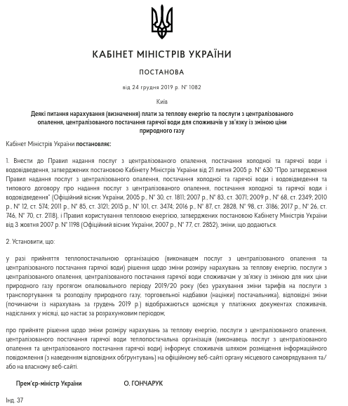 Постановление от 24 декабря 2019 года № 1082 "Некоторые вопросы начисления (определения) платы за тепловую энергию и услуги по централизованному отоплению, централизованному снабжению горячей воды для потребителей в связи с изменением цены природного газа" опубликовано на Урядовом портале.