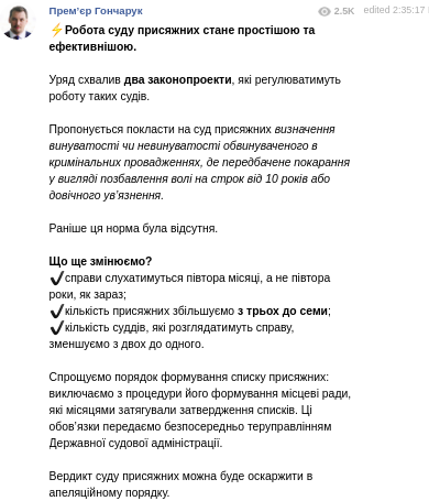 "Работа суда присяжных станет проще и эффективнее. Правительство одобрило два законопроекта, регулирующие работу таких судов", - написал Гончарук.