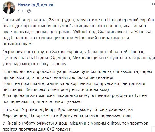 Синоптик Наталья Диденко предупредила украинцев о похолодании и сильном ветре в субботу, 28 декабря. Об этом она написала в Facebook.