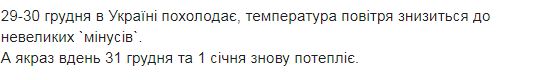 "29-30 декабря в Украине похолодает, температура воздуха понизится до небольших "минусов". Но днем 31 декабря и 1 января снова потеплеет", - резюмирует синоптик.