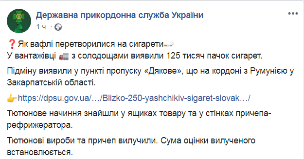 Украинские пограничники задержали в пункте пропуска "Дьяково" на границе с Румынией грузовик с крупной партией сигарет. Об этом сообщается в Facebook Государственной погранслужбы Украины.